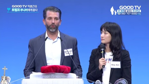 트럼프 정부 2기 출범을 앞두고 트럼프 주니어가 한국서 나눈 간증 영상이 화제다. 지난 8일 GOODTV 공식 유튜브 채널에 올라온 영상만 해도 하루 새 조회수 4만3,000회를 넘기는 등 인기를 끌고 있다.