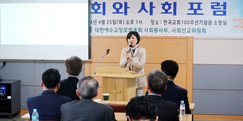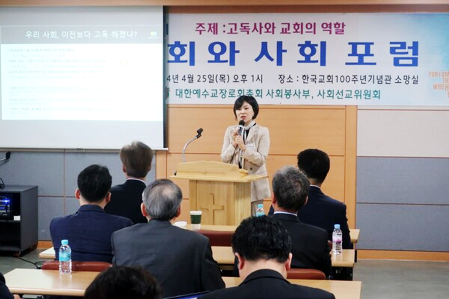 대한예수교장로회 통합 총회사회봉사부 사회선교위원회는 25일 한국교회100주년기념관에서 \'제108회기 교회와 사회 포럼 - 고독사와 교회의 역할\'을 개최했다. 사진은 발제자로 나선 박민선 오픈도어 이사장. ⓒ데일리굿뉴스
