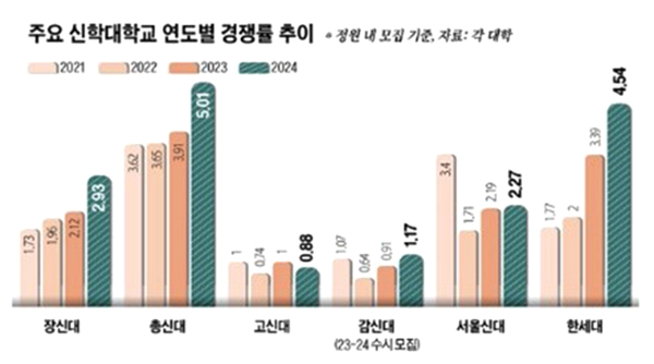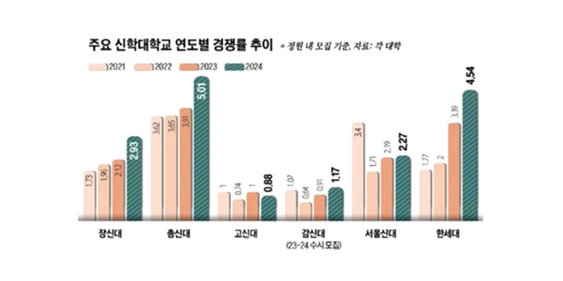 예장합동 교단의 총신대학교 신학과는 79명 모집 정원에 396명이 지원해 5.01대1의 경쟁률을 기록했다. 지난 3년새 최고 수준이다. 총신대 신학과 경쟁률은 2021년 3.62대1, 2022년 3.65대1, 2023년 3.91대1로 꾸준한 상승세를 보였다.
