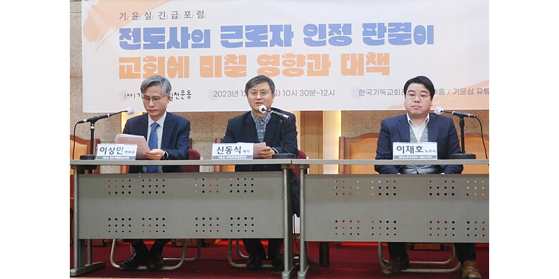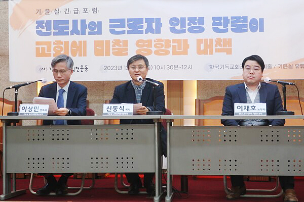 기독교윤리실천운동은 8일 한국기독교회관 조에홀에서 \\\'전도사의 근로자 인정 판결이 교회에 미칠 영향과 대책\\\'이라는 주제로 긴급포럼을 열었다. (왼쪽부터) 이상민 법무법인에셀 변호사·신동식 기독교윤리실천운동 교회신뢰운동본부장·이재호 위디노무사사무소 대표노무사. ⓒ데일리굿뉴스