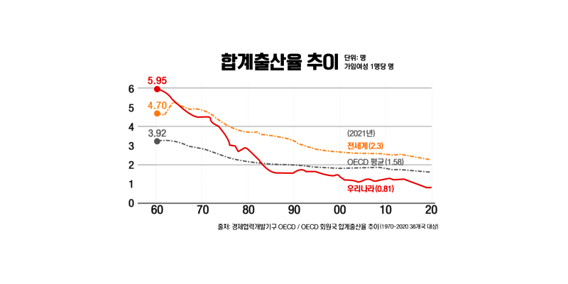 한국의 저출산 현상은 시간이 갈수록 심화되고 있다. 올해 3분기 합계출산율은 0.7명으로 집계됐다. 경제협력개발기구 OECD 주요국은 물론 전 세계에서도 가장 낮은 수치이고, 감소 속도도 가장 빠르다.