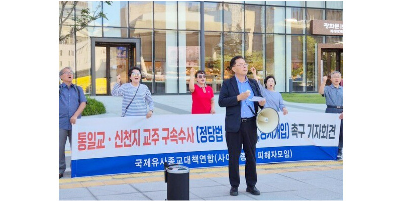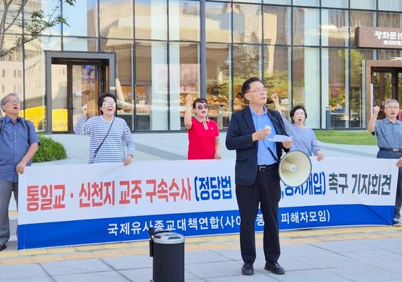 국제유사종교대책연합 피해자모임(신강식 대표)은 10일 서울 종로구 KT광화문빌딩 앞에서 기자회견을 열고 "통일교 지도부에 대한 구속영장 청구 및 강제 수사를 즉각 진행하라"고 촉구했다.