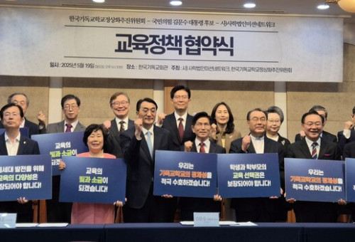 대선을 앞두고 기독교 교육계가 정치권에 기독사학의 자율성과 학부모의 교육 선택권 보장을 촉구하고 나섰다.사학법인미션네트워크(사학미션·이사장 이재훈 목사)와 한국기독교학교정상화 추진 위원회 (기정추·위원장 김운성 목사)는 지난 19일 서울 종로구 한국기독교회관에서 '제21대 대통령 선거 교육정책 협약식'을 열고, 국민의힘 김문수 대선 후보와 교육 관련 정책 협약을 맺었다.협약식에는 김문수 후보를 비롯해 권성동·조정훈·조배숙·이만희 국민의힘 의원, 최재형 전 감사원장 등이 참석했으며, 교계에서는 김종준 목사(꽃동산교회), 고명진(수원중앙침례교회) 목사, 박상진 사학미션 상임이사, 김순미 한국교회연구원 이사장 등이 자리했다.이날 맺은 협약서에는 ▲학부모의 교육 선택권 보장 ▲학교 자율성과 교사의 교육권 증진 ▲교육의 공공성 실현 ▲사립학교의 건학이념 존중 등의 내용이 담겼다.김문수 후보는 "자유 대한민국의 토대는 미션스쿨과 선교사들의 교육 헌신에서 비롯됐다"며 "경기도지사 재임 당시 학생인권조례 개혁과 사립학교 평준화, 자사고 폐지 반대에 힘썼지만 한계가 있었다. 앞으로 올바른 교육정책을 수립하는 데 적극 협력하겠다"고 밝혔다.사학미션 이사장 이재훈 목사는 "기독사학은 국가 발전의 토대였지만 최근 고교 평준화, 사립학교 공립화, 학생인권조례 등으로 건학이념을 실현하는 데 어려움을 겪고 있다"며 "교육의 다양성과 창의성이 보장될 수 있도록 해달라"고 강조했다.기정추 위원장 김운성 목사는 "사람을 만드는 것이 교육이며, 현재 대한민국이 옳고 그름을 제대로 판단하지 못하는 이유는 교육 실패의 결과"라며 "정직과 공의를 사랑하는 하나님을 경외하는 마음으로 올바른 교육제도가 마련되길 바란다"고 말했다.