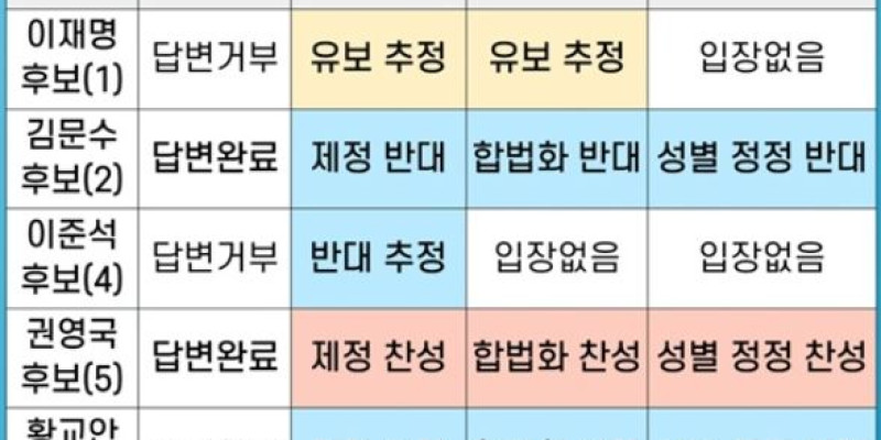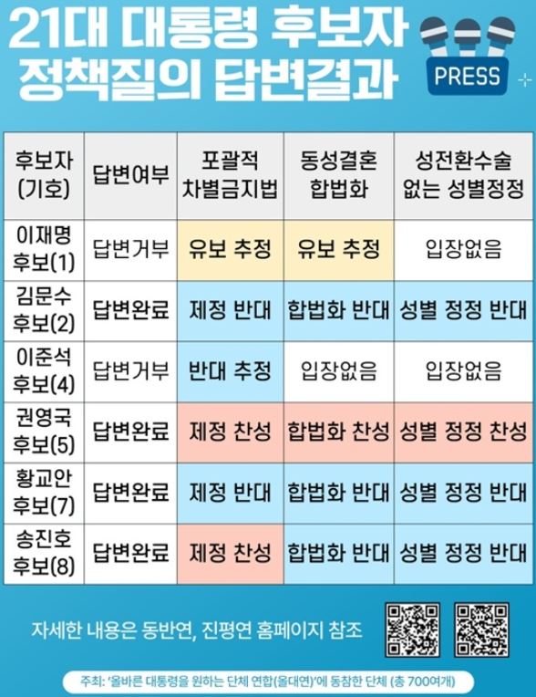 올바른대통령을원하는단체연합(올대연)이 공개한 정책 질의 결과에 따르면, 김문수 후보는 ▲포괄적 차별금지법 제정 ▲동성결혼 합법화 ▲성전환 수술 없는 성별 정정 등에 모두 \\\'반대\\\' 입장을 밝혔다.
