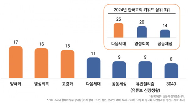 이같은 조사결과는 지난해 1월 ‘2024년 한국교회 키워드’ 조사 결과와 약간의 차이가 있다.
