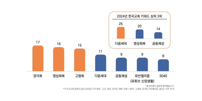 936명이 응답한 조사 결과 양극화 17%, 영성회복 16%, 고령화 15% 순이었다. 이어 ‘다음세대’ 11%, ‘공동체성’ 9% 등의 순이었다.