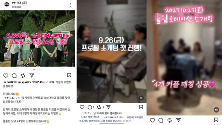 SNS 기반의 '소개팅 가장 포섭' 사례가 대표적이다. 탈퇴자들이 제보한 계정들을 확인한 결과, '소개팅', '프로필 매칭' 등을 내세워 길거리 만남과 파티룸 모임, 로테이션 소개팅 등을 홍보하고 있었으며, 대부분 비공개 DM 문의 방식으로 운영됐다.