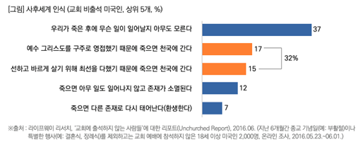 전체적으로 언처치드의 1/3(32%)이 사후에 천국에 간다고 인식하고 있어서 기독교적 요소뿐 아니라 비기독교적 인식도 혼재하는 ‘혼합적’ 구조가 형성되어 있음을 보여준다.