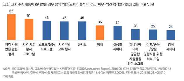 다시말하면 언처치드들에게는 ‘예배 초대’보다 ‘지역 봉사(행사)’ 통한 교회 초대가 더 효과적일 수 있다는 것이다.