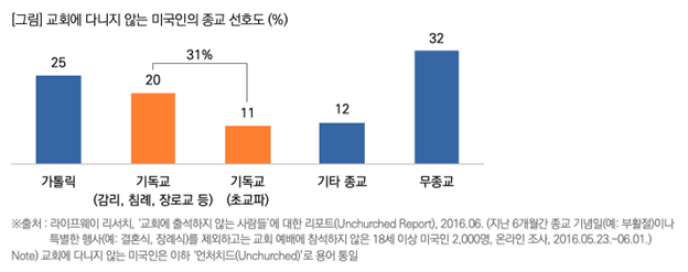 최근 목회데이터연구소가 발표한 미국의 기독교통계에 의하면 지난 6개월간 예배에 한 번도 참석하지 않은 미국인들(Unchurched) 중 31%가(감리, 침례, 장로교 등과 초교파 포함)가 현재 자신이 선호하는 종교라고 밝혔다.