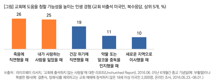 더불어 언처치드들은 , ‘죽음/상실’의 위기에서 교회의 도움 요청할 가능성 높다는 것을 기억하자. 언처치드들은 ‘죽음과 상실’과 관련된 극단적 위기 상황에 가장 높은 응답률을 보였다.