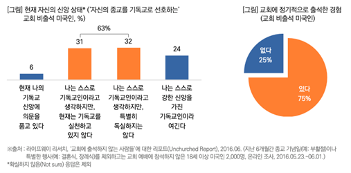 주목할 것은 현재의 언처치드 75%는 한때 교회 정기 출석자였다!는 사실이다. 교회에 다니지 않지만 스스로를 기독교인이라고 인식하는 이들 중 63%는 ‘비실천적·비독실 신앙’ 범주에 속했다. 언처치드 3명 중 2명 가까이가 기독교 정체성은 유지하되 실천으로 이어지지 않는 그룹이었다.