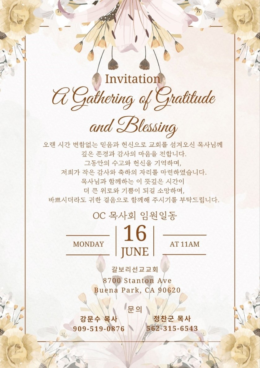 행사 장소는 부에나파크 소재 갈보리선교교회(심상은목사 담임, 8700 Stanton Ave., Buena Park)이며 원활한 준비를 위해 사전예약을 부탁하고 있다.