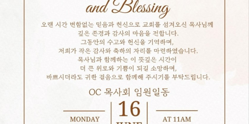 OC목사회(회장 강문수목사)가 인근 지역에 거주하시는 원로목사 부부 초청 위로 잔치를 개최한다.