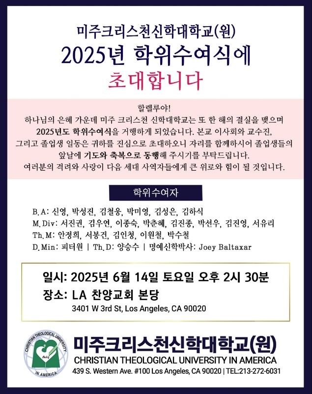 미주크리스천신학대학교(원)의 2025년 학위수여식이 6월14일 토요일 오후2시30분에 LA찬양교회 본당에서 열린다.