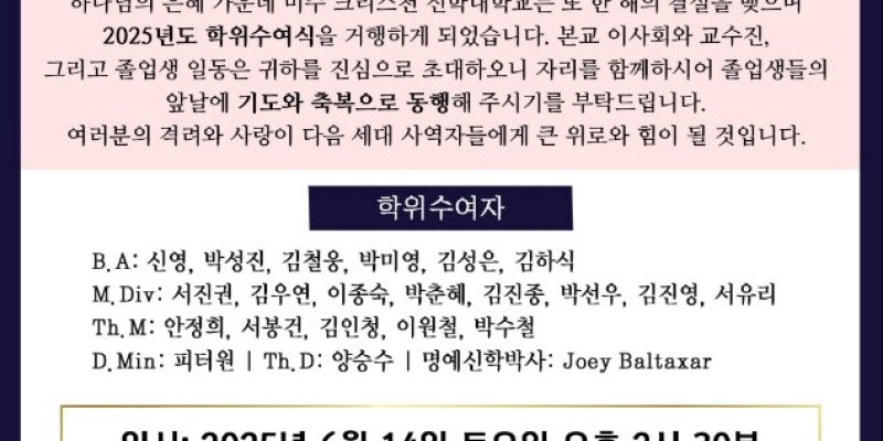 2025년도 학위 수여자는 BA, 신영 박성진, 김철용, 박미영, 김성은, 김하식, M Div에 서진권, 김우연, 이종숙, 박춘혜, 김진종, 박선우, 김진영, 서유리, Th.M. 은 안정희, 서봉건, 김인청, 이원철, 박수철, D.Min은 피터원, Th.D. 양승수, 그리고 명예신학박사는 Joey Baltaxar가 받게된다.