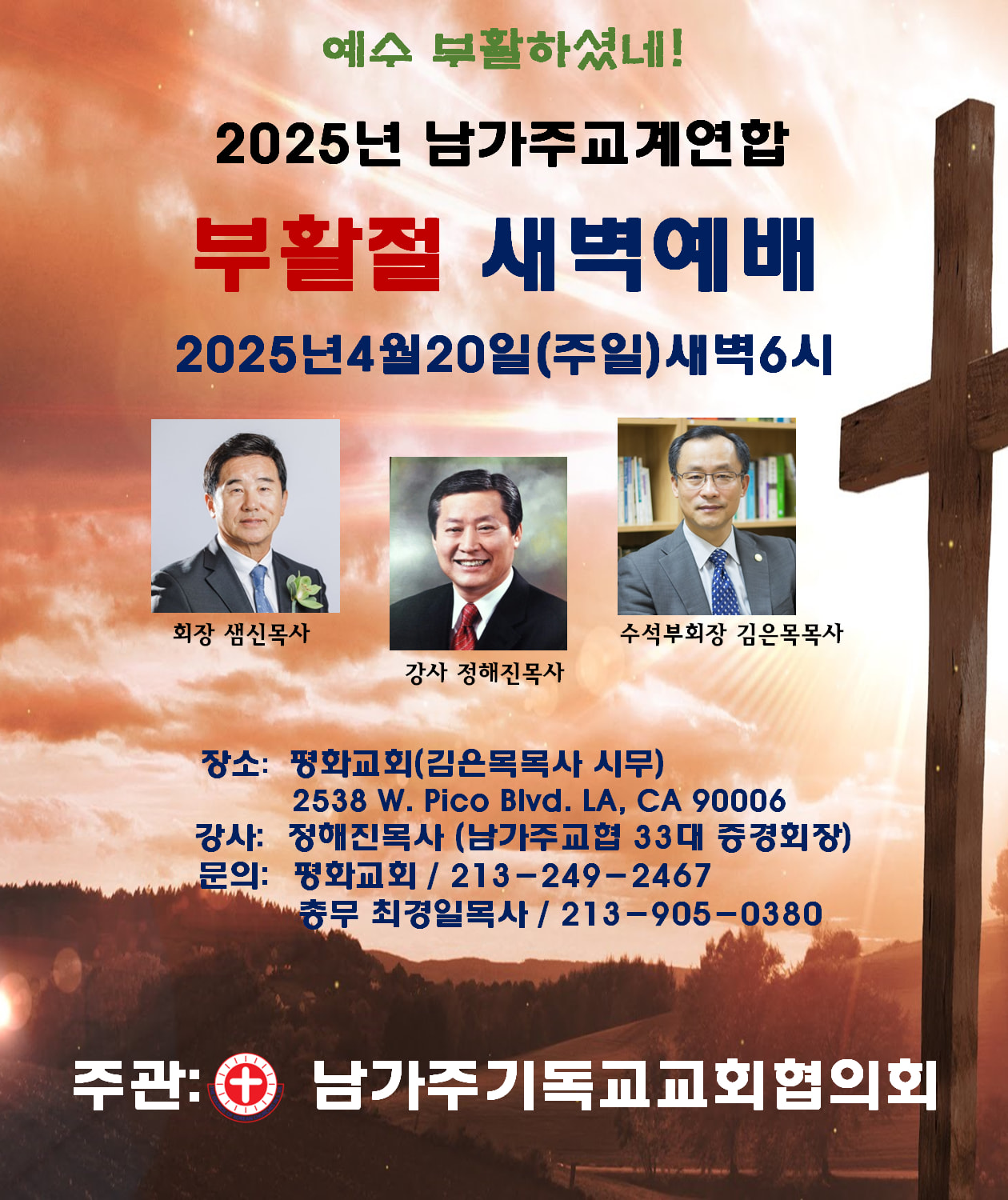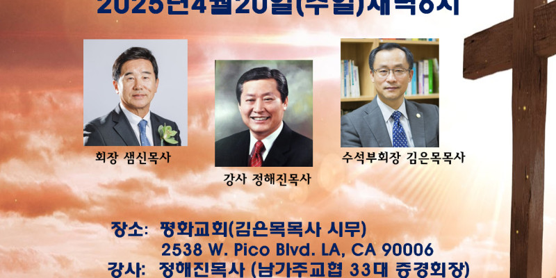 남교협(회장 샘신목사), 2025 부활절새벽예배가 LA지역 교회들과 함께 연합으로 드려진다. 남교협은 LA 지역 교회들 중에 부활절새벽예배를 드리지 않는 교회와 성도들이 한 자리에 모여 죽음을 이기고 부활하신 예수 그리스도를 맞이하며 드리는 새벽예배는 오래전부터 성도들과 교회들의 전통이었음을 상기하고 인근 지역 목회자들과 성도들을 초대한다고 밝혔다.
