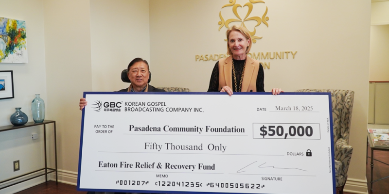 미주복음방송(사장 이영선 목사)은 진나 3월 18일 오전 11시, Pasadena Community Foundation(PCF)을 방문하여 산불 피해 복구를 위한 지원금 50,000달러를 전달했다. 이번 기부금은 최근 Eaton 화재로 피해를 입은 Altadena 및 Pasadena 지역 주민들을 돕기 위해 PCF가 설립한 'Eaton Fire Relief & Recovery Fund'에 사용될 예정이다.