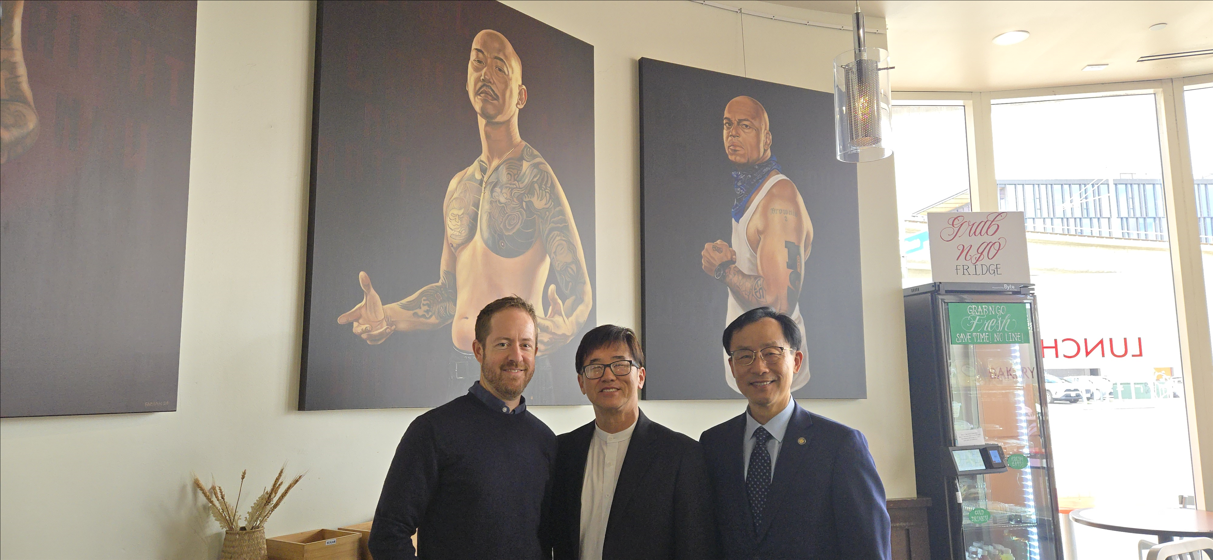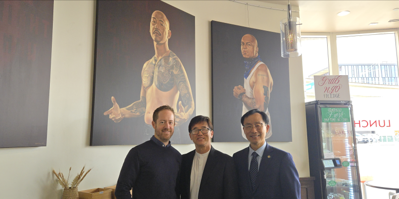 왼쪽부터 LA Voice 회장 Zachary Hoover 목사, 남가주교협 회장 샘신목사, 수석부회장 김은목목사