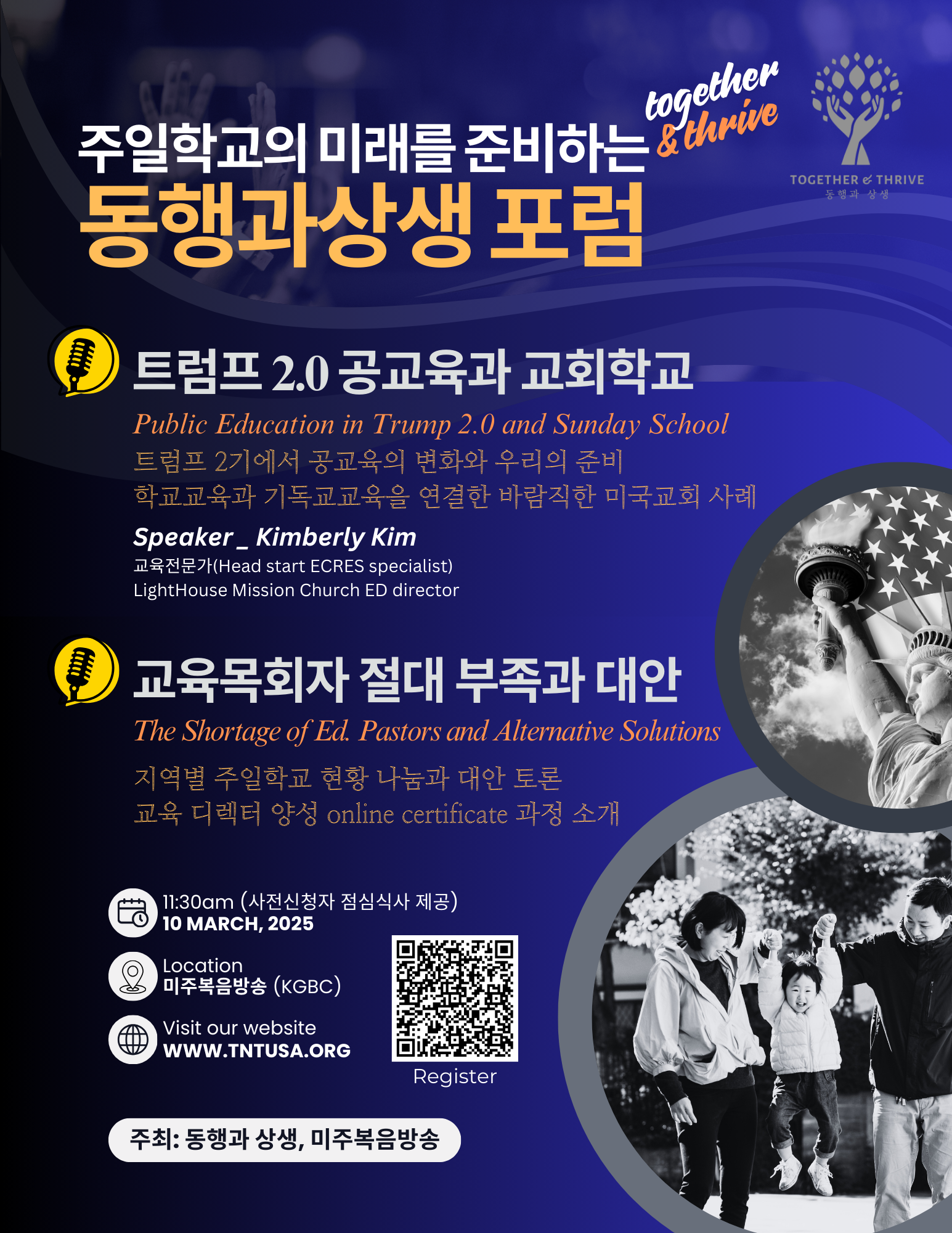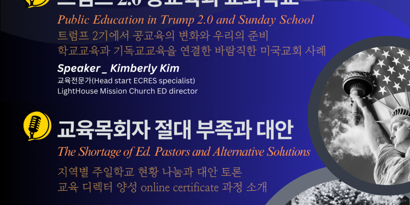이번 포럼은 "Public Education in Trump 2.0 and Sunday School" 및 "The Shortage of Ed. Pastors and Alternative Solutions"라는 두 가지 주요주제를 중심으로 진행되며, 미국 내 한인교회 교육 시스템의 변화와 차세대 교육 목회자의 부족 문제에 대한 대안을 논의할 예정이다.