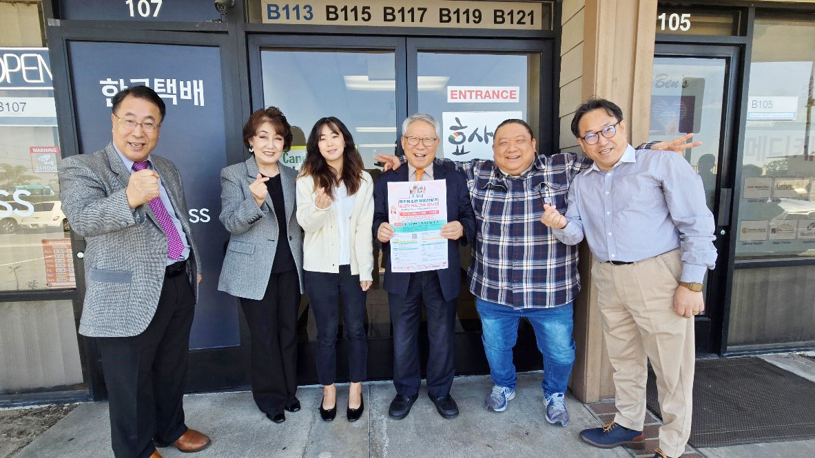 왼쪽부터 박용일목사, 미쉘 오 여류화가(그림 심사위원), 지혜간사, 대표 김영찬목사, 폴 임전도사(글짓기 심사위원), 조성우목사(행정 담당 및 효 시니어 대학 학장)가 인터뷰를 마친뒤 기념 촬영을 하고 있다.