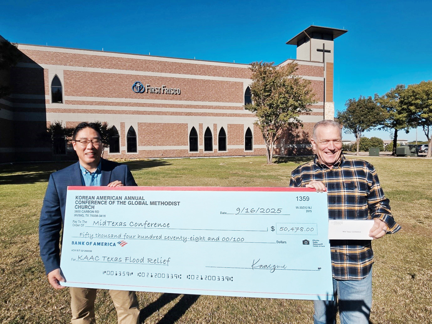 지난 7월 텍사스 지역에 발생한 대규모 홍수 피해 복구를 위해 글로벌감리교회 한미연회(Korean American Annual Conference, GMC)가 구호헌금 56,853달러를 GMC Mid-Texas 연회에 전달했다.