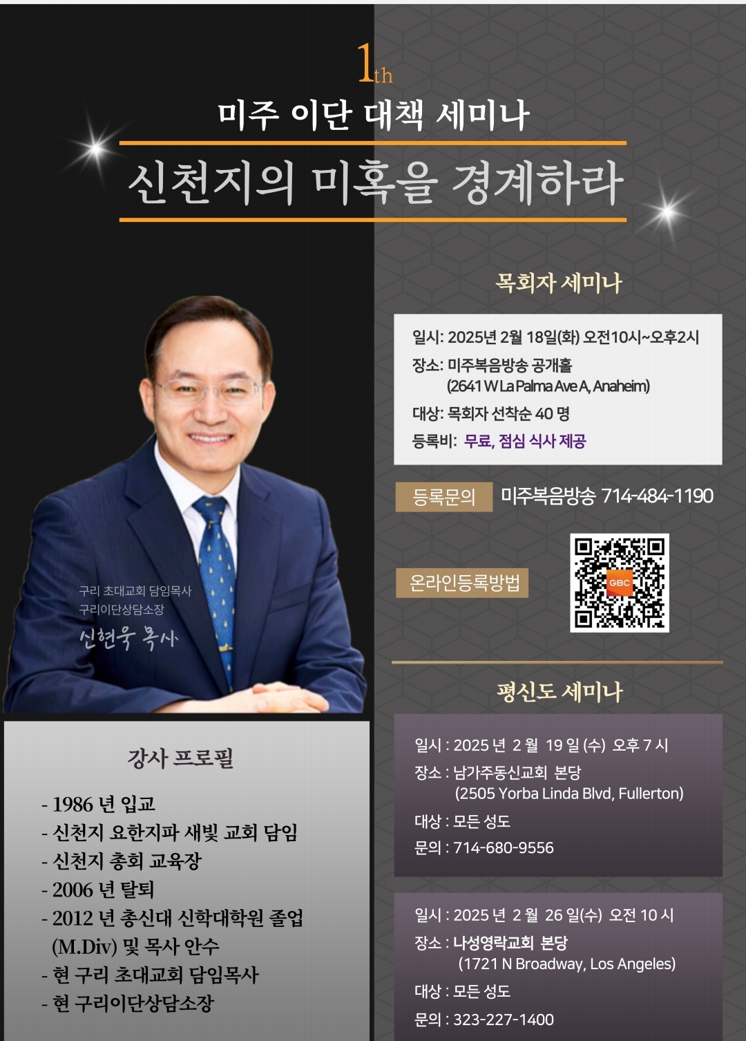 남가주 목회를 위한 이단 세미나는 2월 18일 (화) 오전 10시~ 오후 2시까지, 장소는 미주복음방송 공개홀 (2641 W. La Palma Ave. Anaheim, CA 92801)이며 참가대상은 지역교회 목회자 및 사역자 선착순 40명이고 참가비는 없다. (점심식사 제공) 등록 마감은 2월13일 금요일로 온라인등록은 https://forms.gle/AXNwaD3PVJXxMhx28 이며 문의는 미주복음방송 (714-484-1190)로 하면된다.