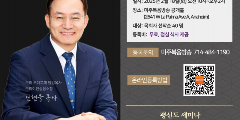 세미나는 무료로 진행되며, 점심식사가 제공된다. 참석에 대한 문의는 미주복음방송(714-484-1190) 으로 하면 된다.