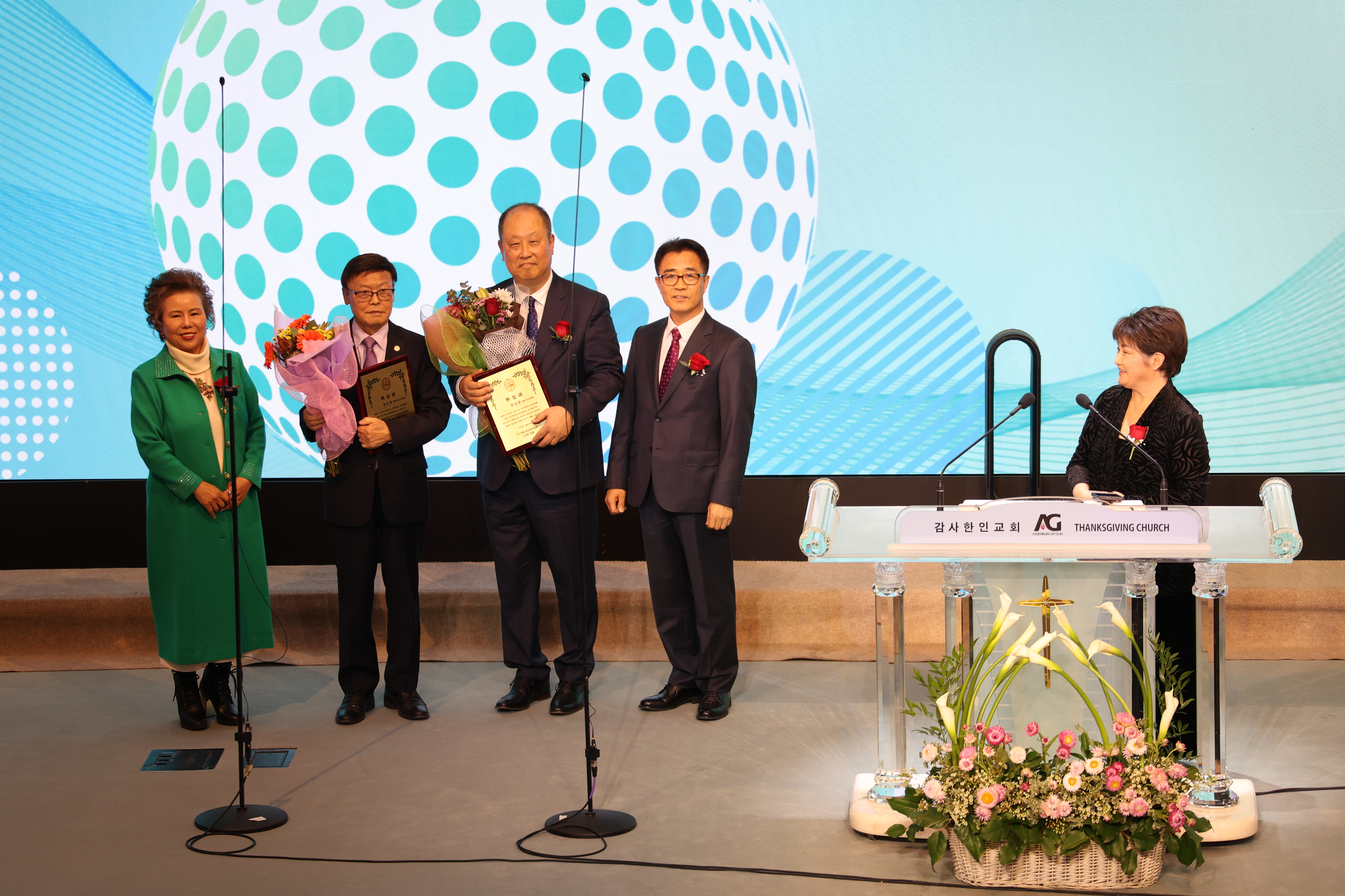 왼쪽부터 이임 이사장 민 김 권사, 신임 이사장 김도영장로, 신임 회장 한성준 집사, 이임 회장 신용 집사, 사회를 맡은 방송인 윤우경 권사