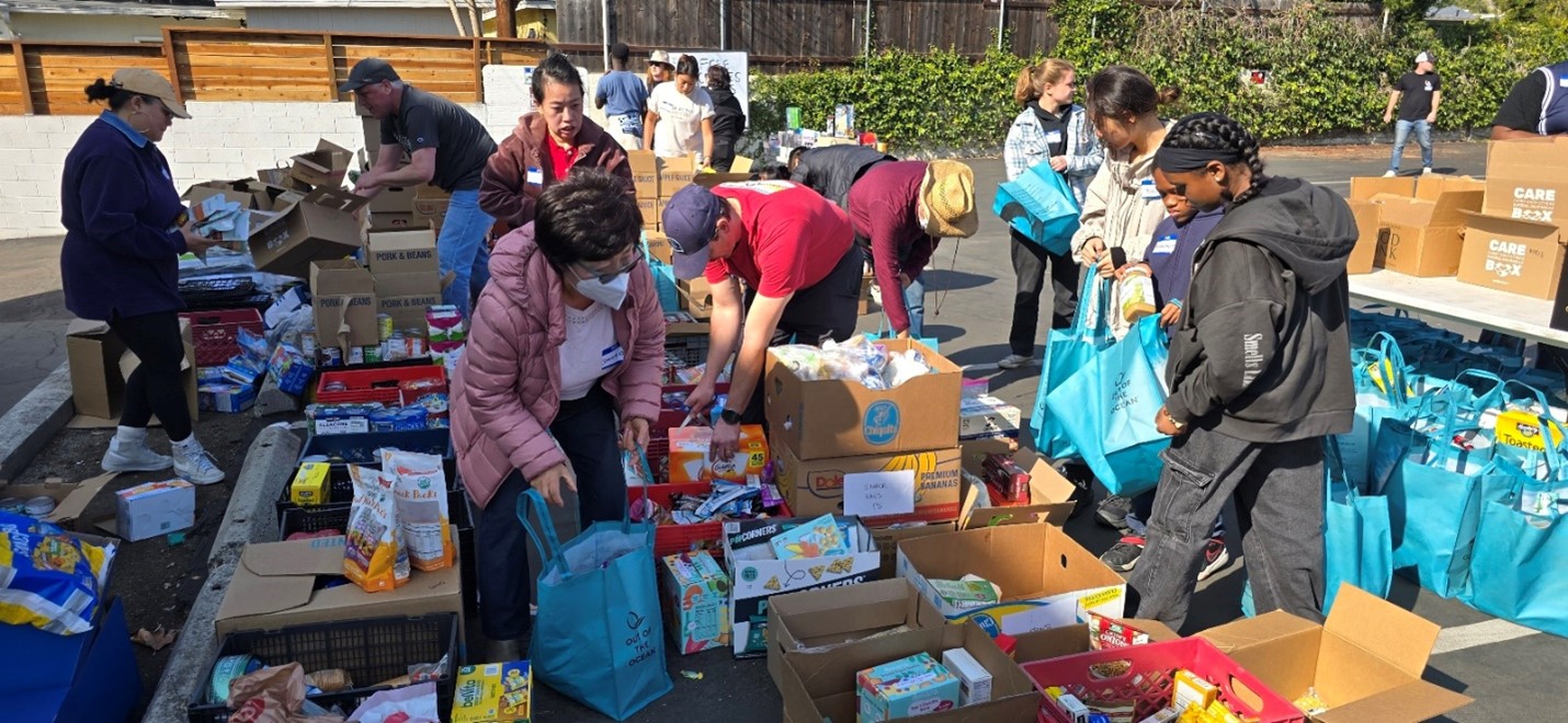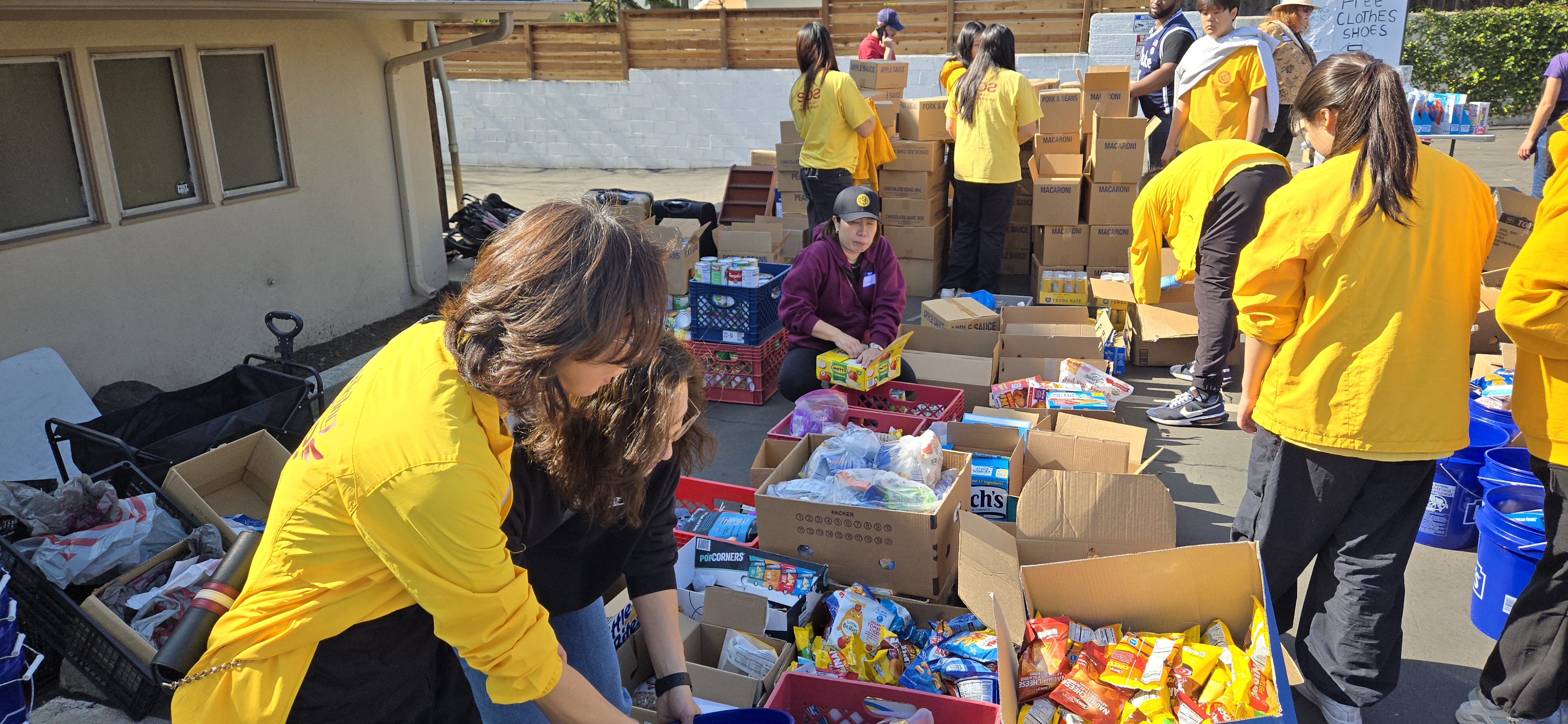 산불피해 주민들을 돕기위한 구호품을 모으고 정리하며 배포하는 일이 계속되고 있다. 사진 맨오른쪽이 남교협 샘신 회장과 그 옆은 갈보리선교교회 심상은 목사와 성도들, 왼쪽 맨 끝은 하사랑교회 이원석목사