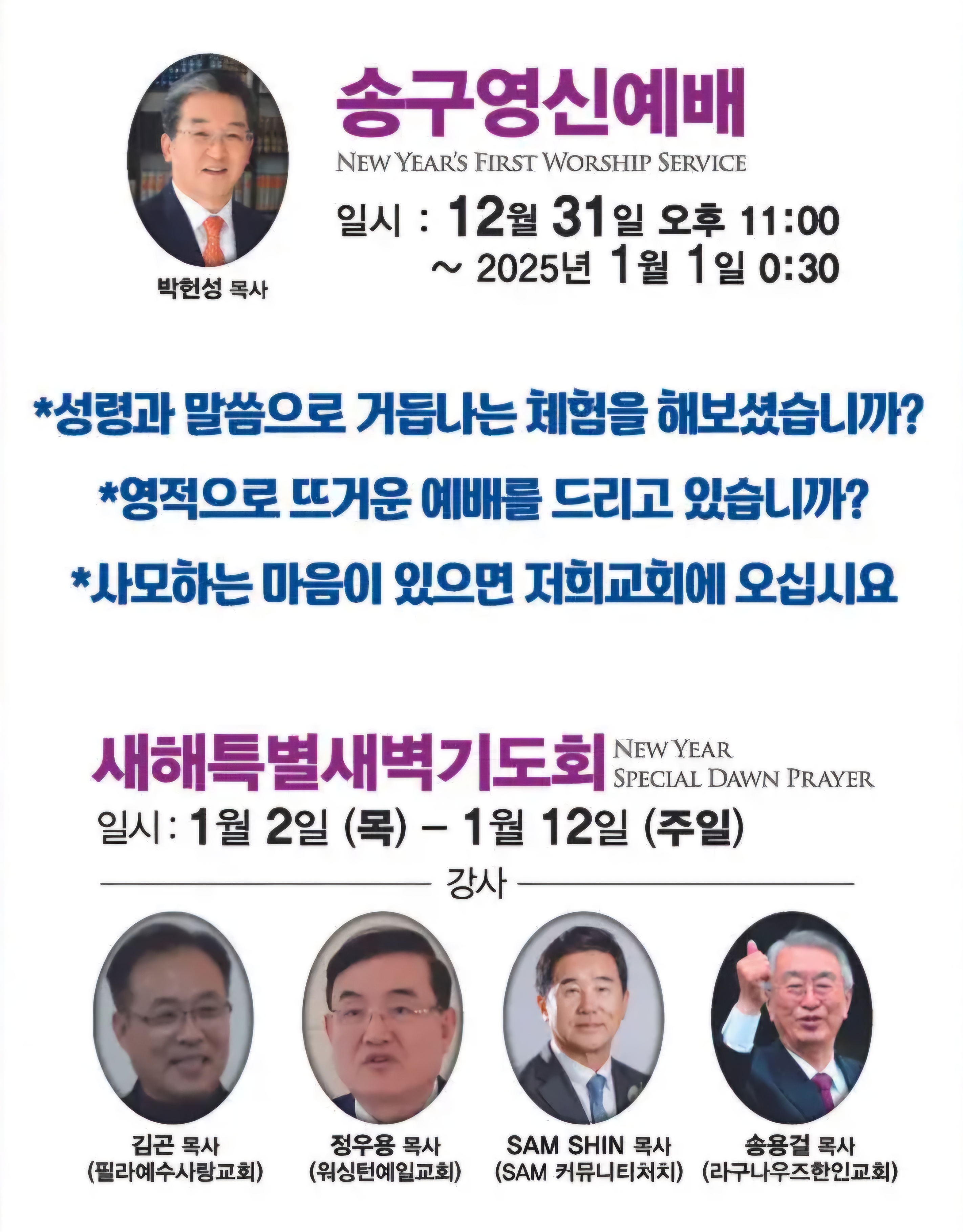 서부열린문교회(박헌성목사 딤임)는 새로운 비전을 꿈꾸는 교회라는 주제로 필라예수사랑교회 김곤목사, 워싱턴예일교회 정우용목사, SAM커뮤니티교회 샘신 목사(남가주교회협의회 회장), 그리고 라구나우즈한인교회 송용걸 목사를 초청해서 1월2일부터 새해특별새벽기도회를 진행한다.