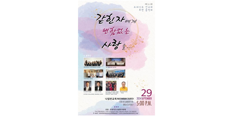 제소자들을 위한 사역을 지원하고 있는 오네시모 선교회(창립자 김석기목사)가 다가오는 9월 29일 주일 저녁 5시, 오렌지 카운티 브레아 시에 위치한 나침반 교회 (담임목사: 민경엽 목사, 주소: 1200 W. Lambert Rd., Brea, CA, 92821)에서 제21회 오네시모 선교회 후원음악회를 개최한다.