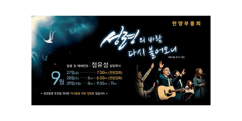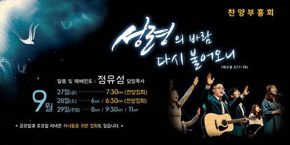 9월 27일(금) 저녁 7시 30분, 28일(토) 저녁 6시 30분은, 찬양집회로, 토요일 새벽과 주일 1,2,3부는 예배로 진행되는데 정유성목사는 교회적으로 근 10년만에 갖게 디는 부흥회라 많은 기대와 함께 기도준비가 있다고 밝혔다.