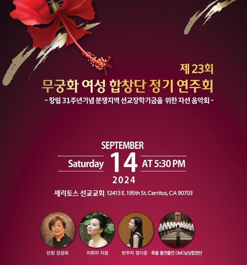 창립 31주년을 맞은 무궁화 여성 합창단(단장 강성희 지휘 지경교수)이 지난 2024년 9월 14일 오후 5시30분, 세리토스선교교회(방상용목사 시무)에서 제23회 정기 연주회를 개최했다.