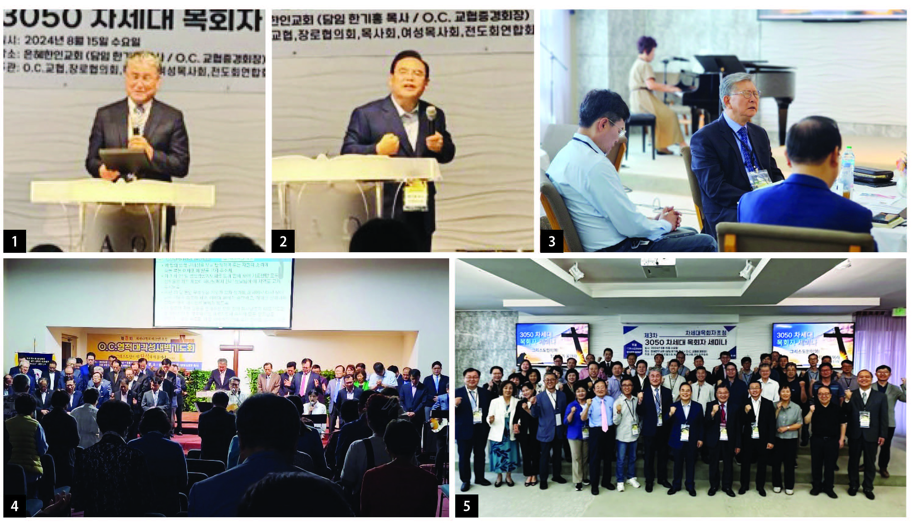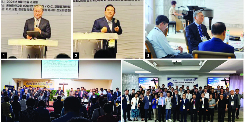 1. 심상은 목사가 오전 강의를 마치면서 기도회를 인도하고 있다. 2. 제4강의 강사로 선 한기홍목사(목회자세미나 대회장)이 참석자들에게“교회를 기도하는 공동체로 만드십시오”라는 주제로 강의하고 있다. 3. 강사로 나선 권혁빈목사, 김영길목사, 한기홍목사가 함께 기도하고 있다. 4. 7월22일-8월14일까지 21일간 열렸던 차세대영적대각성새벽기도회 마지막날, 심상은목사가 강사목회자들과 21일간 대표기도를 담당했던 OC장로협의회 장로들을 세우고 참석자들과 함께 지역사회의 회복과 부흥을 위해 기도하고 있다. 새벽기도회를 마친 후에는 갈보리선교교회 성도들이 100여명 이상의 참석자들에게 날마다 조찬을 마련하는 정성을 쏟았다. 5. 목회자세미나를 마친 후, 21인 강사들과 준비위원등이 기념 촬영을 하고 있다.