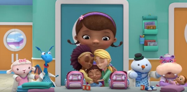 디즈니 애니메이션 \'꼬마 의사 맥스터핀스\'에 부부로 등장한 레즈비언 커플(가운데)이 머리를 맞대고 있다.(사진출처=Disney