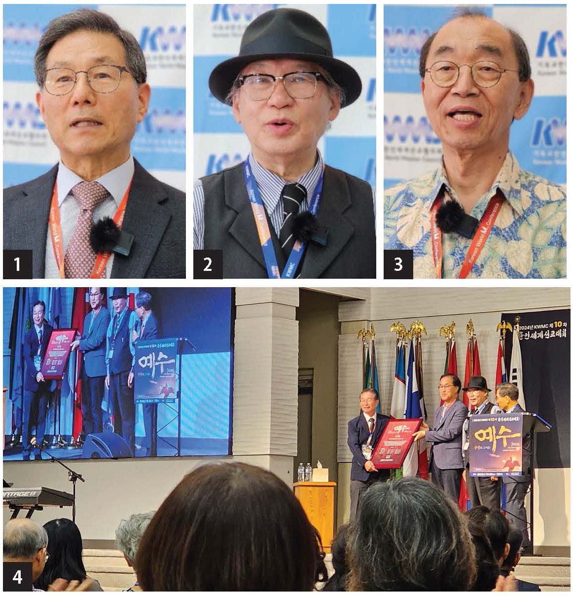 ➊ KWMC사무총장 조용중 선교사 KWMC, ➋ 1988년 제1차 세계선교대회를 시작으로 30년째 상임의장으로 활동하는 고석희 목사, ➌이승종 목사 (KWMC 대표의장), ➍ 대회를 마치면서 이번 행사를 위해 장소와 기금 제공 등에 앞장선 대회장 남가주사랑의교회(노창수 목사 담임)에서 감사패를 전하고 있다.