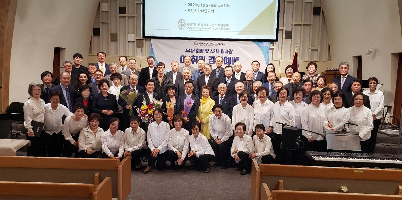 OC기독교전도회연합회(이하 연합회, 회장 신용)가 27일(토) 오렌지가나안교회(담임 김인철 목사)에서 44대 회장 42대 이사장 이취임 감사예배를 드렸다. 44대 회장에는 현 신용 회장이 연임하고, 42대 이사장에는 직전 회장을 역임한 민김이 취임했다.