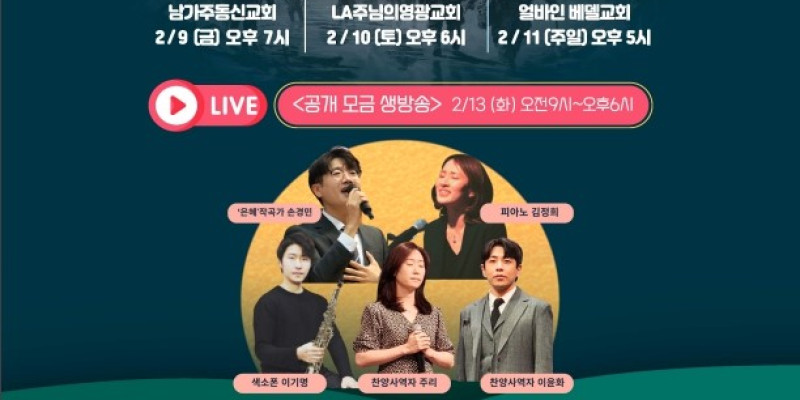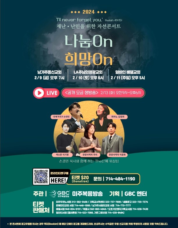 미주복음방송(사장 이영선)에서는 2024년 상반기의 첫 행사로 오는2월 9일(금)부터~ 11일(일)까지 남가주동신교회, LA주님의영광교회,얼바인 베델교회 3곳에서 ‘2024 나눔On 희망 On’ 자선콘서트를 개최하고, 이어 2월 13일(화)에는 '나눔On 공개모금생방송' 을 진행한다.