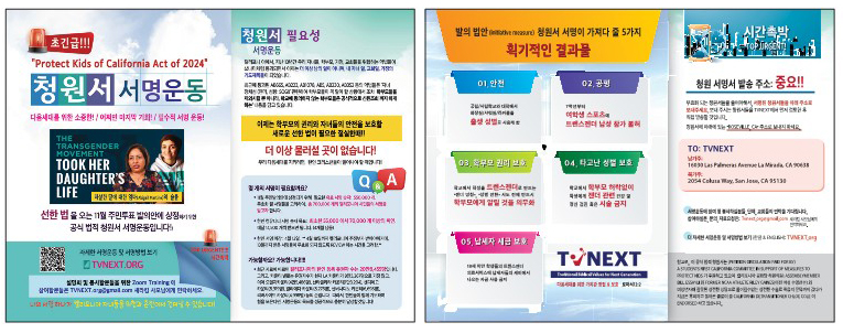 사라 김 대표는 그 당시 서명 운동이 무산된 결과가 오늘날 공립학교에 일어나고 있는 믿기지 않는 현실이라고 지적했다. “13년전, 2010년도 TVNEXT에서 SB48 관련, 서명 운동을 했었다. 결과는 역사상 최초로 캘리포니아 모든 공립학교의 교과서를 바꿨다. 바꾼 이유는 ‘동성애는 정상이다’라는 개념을 심어주기 위해서이다. 정치적 올바름(Political Correctness) 이라는 명목 아래 성정체성 혁명이 일어났다. 반기독교적 혁명이다. 그렇게 흘러간 세월 속에 지금은 어떨까? 공립학교 도서관에 누구나 펼쳐 볼 수 있는 책 가운데 동성애가 정상이라고 묘사한 책이 들어가 있다. 악법들이 통과된 이후의 결과이다.”