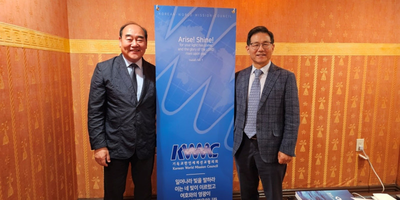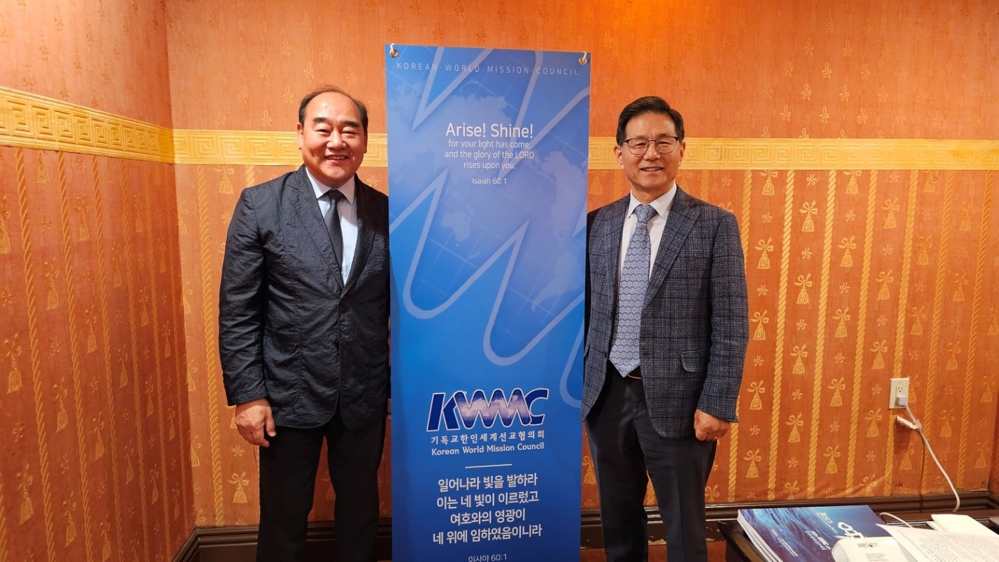 KWMC 조용중 사무총장(우), 이명철 사무국장(좌)이 선교대회를 설명한 후 기념촬영.