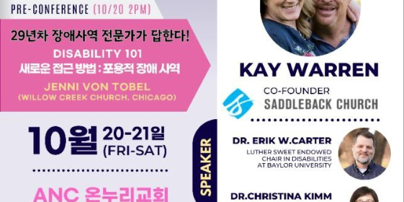 10월 20일 오후 2시 ANC온누리교회 본당에서 열리는 Pre-컨퍼런스 ‘Disability 101 : 포용적 장애 사역’에는는 지지플레이 하우스 디렉터 등 30여년동안 장애인과 그 가정을 위한 사역에 몸담아 온 제니 본 토벨(Jenni Von Tobel)이 교회내 포용적인 장애사역의 경험을 토대로 한 실질적인 방법과 전략을 공개하게된다. 장애사역의 시작부터 운영관련, Q&A시간도 마련되며 전체 컨퍼런스 참가비 외 별도 참가비40불로 저녁식사까지 제공된다.