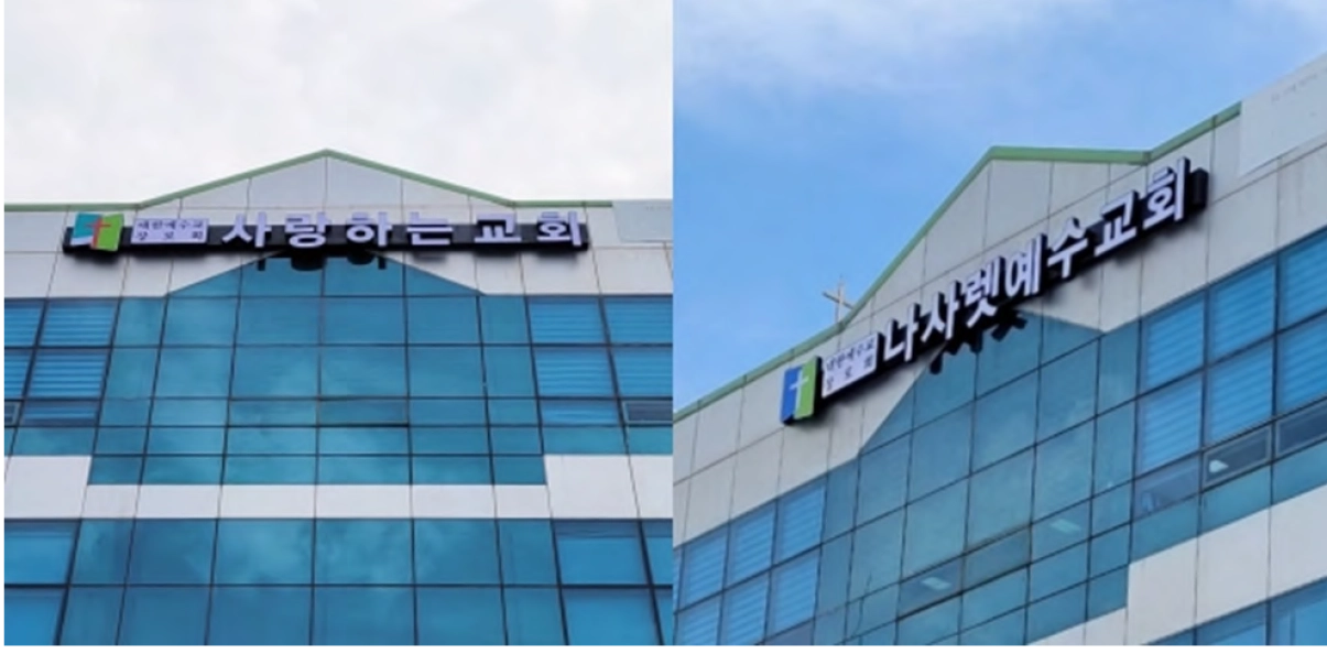 광주시내에 있는 대한예수교장로회 사랑하는교회(왼쪽). 불과 한달 전만 해도 대한예수교장로회 합동 나사렛예수교회 간판을 걸고 입당예배를 드렸다.