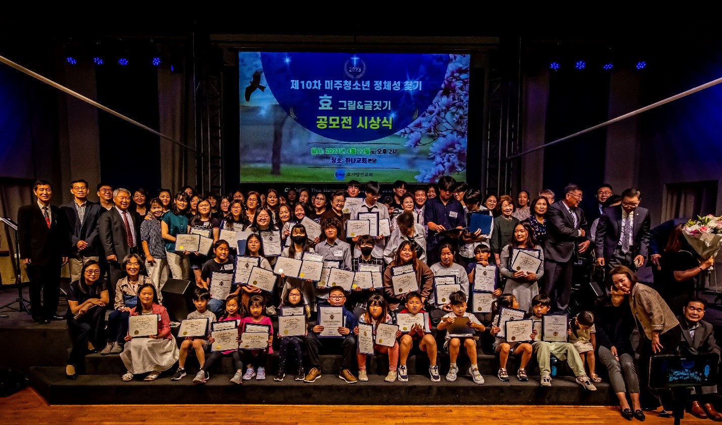 효사랑선교회 주최 제10회 한인청소년 정체성확립을 위한 효글짓기 그림 공모전 시상식을 마치고 관계자들이 기념촬영을 하고 있다.