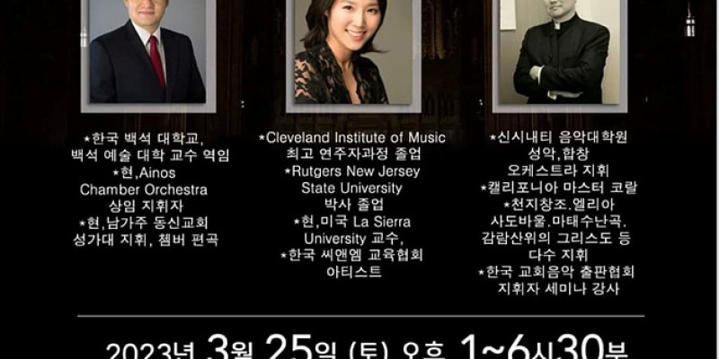 이 세미나는 1시 부터 6시 30분 까지 진행되며 강사에는 노용진 목사(Ainos Chamber Ochestra상임 지휘자, 남가주 동신교회 성가대 지휘, 쳄버 편곡), 이래진 교수(La Sierra University 교수), 김원재 지휘자(캘리포니아 마스터 코랄)가 나선다.