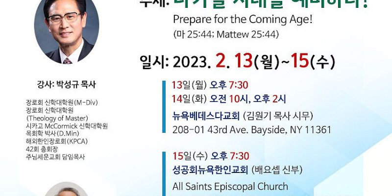 박성규 목사(주님세운교회 담임)는 2월13일 부터15일 까지 “다가올 시대를 대비하라!”라는 주제로 뉴욕지구한인교회협의회가 주최하는 "목회자 및 평신도지도자 세미나와 부흥성회"를 인도한다.