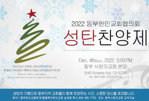 동부한인교회협의회(회장 우영화 목사)는 지난 4일 주일 오후 5시에 동부사랑의교회 본당에서 2022년 성탄연합찬양제를 열고 그리스도의 오심을 찬양하는데 마음을 모았다. 엘에이 동부지역 10개 교회가 연합해 열린 찬양제는 김병학 목사(주님의 교회 담임)의 사회와 우영화목사의 환영인사에 이어 박선호 목사(늘푸른교회)가 대표기도하고 고승희 목사(아름다운 교회)가 마1:18-21절을 본문으로 "의로운 사람 요셉"이란 제목으로 말씀을 전했다.   남가주 장로 중창단이 "은혜, He Touched Me"를 불러 성가제의 무대를 열었고 이어 글로발선교교회가 “Esto Les Digo, Bound for Jubilee”를, 나성한미교회 찬양팀이 '찾아오신 예수, 문들아 머리들라'를 불렸다. 남가주주님의교회 찬양팀은 자자곡인 '그의 성소에서 찬양할지어다, 작은자의 기도'를 불러 많은 청중들의 호응을 얻었다. 동부사랑의교회 찬양팀의 '여호와는 위대하다,탄일 종 올리네' 찬양으로 1부 성가제가 마쳤다.  이어진 2부 무대는  Calvin Park 집사가 색소폰 특주연주로 문을 열었다. 이어 선한목자교회 찬양팀이 '참 반가운 성도여, 송축해 내 영혼'의 찬양을 불렀고 선한청지기교회팀이 "사랑이 오셨네. 주는 만왕의 왕'을 노래했다. 아름다운교회 찬양팀은 '빛난 별빛 언덕에, 송축해 내 영혼'을 부른 후 유니온교회 찬양팀의 '거룩하신 하나님, 사랑이 예 오셨네'를 불렀다. 끝으로 좋은비전교회가 Days of Elijah, 은혜'로 환상적인 퍼포먼스와 함께 지난 1년간 함께하신 하나님의 은혜를 노래하며 마무리했다.이어진 봉헌송에는 Seryung Chung 집사가 스페셜 첼로 특주를 연주했으며 송병주 목사(선한청지기 교회)가 헌금기도를 우영화 목사의 광고에 이어 고태형 목사(선한목자교회)의 축도로 모든 행사를 마쳤다. 이번 찬양제를 개취한 동부한인교회협의회는 “지역교회의 연합과 동역을 위하여 서로 긴밀하게 협력하고 있다”며 “귀한 연합사역이 더욱 더 풍성해 질 수 있도록 지속적인 기도를 부탁드린다”고 당부했다.