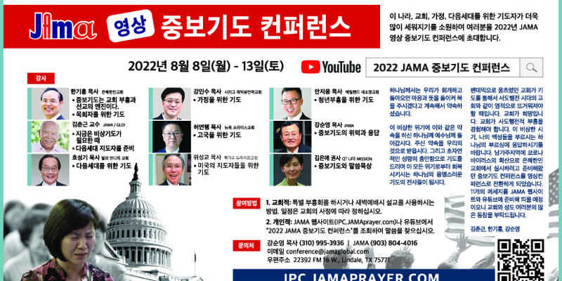 참여를 원하는 교회는 교회의 상황에 맞게 동영상과 담임 목회자의 설교를 적절하게 배합하면 된다. 내용은 유튜브에서 2022 JAMA 중도기도 컨퍼런스를 검색하면 확인할 수 있다. 문의 (310)995-3936, (903)804-4016.