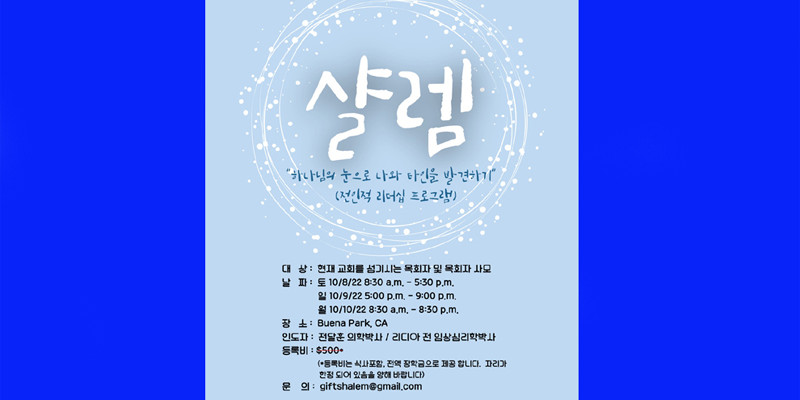 2회 째를 맞는 리더십 프로그램 샬렘은 오는 10월 8일부터 10일까지 기프트(GIFT)상담치유연구원 주최로 부에나팍에 있는 기프트 커뮤니티 센터에서 진행된다.