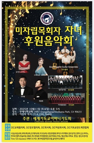 세계기독교어머니기도회(대표 이선자목사)는 다가오는 10월11일 토요일 오후 5시, 부에나파크 교회(7037 Orangethorpe Ave., Buena Park)에서 미자립목회자 자녀 후원을 위한 음악회를 개최한다.
